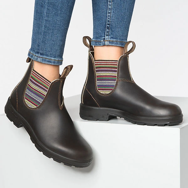 Die Blundstone Chelsea Boots sind mit zwei Anziehlaschen ausgestattet und im Zehen- und Fersenbereich verstärkt. Die flexible Profil-Laufsohle ist rutschhemmend.