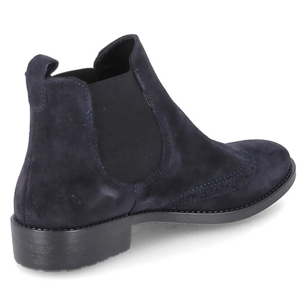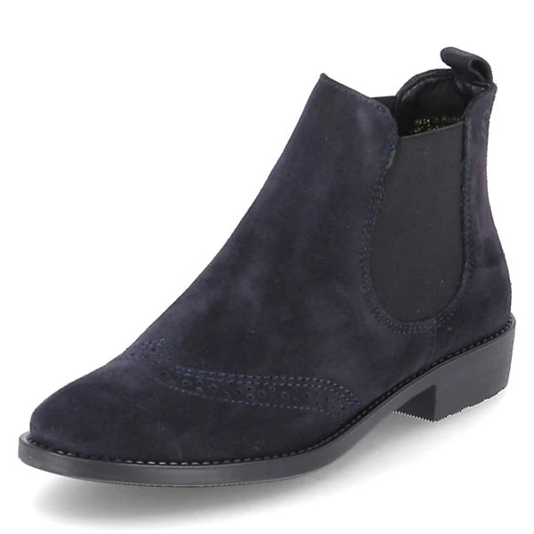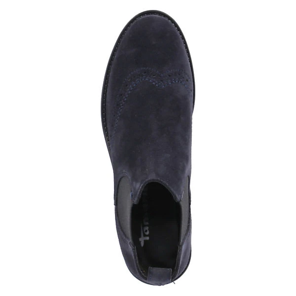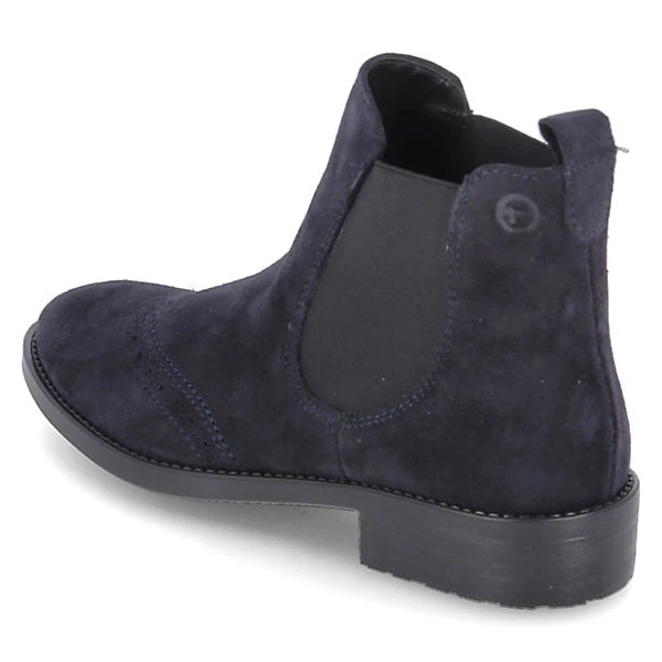 Tamaris Damen Stiefeletten/ Chelsea Boots Blau Leder-Textil Mix – Elastikeinsätze am Schaft – Ziernähte – angedeutetes Budapester Lochmuster – Anziehlasche – gepolsterte Decksohle – verstärkter Zehen- und Fersenbereich – flexible, rutschhemmende Laufsohle